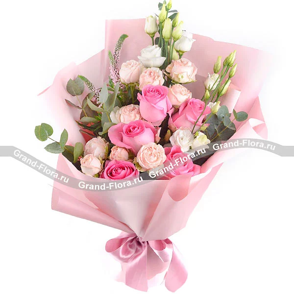 Розовая фантазия - букет из роз и эустомы